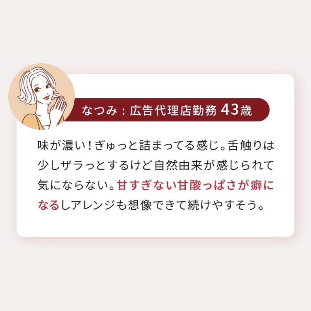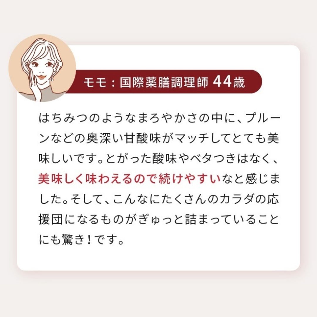 発酵の力により18種類のアミノ酸がバランスよく含み、ヒトの体内ではつくることができない「必須アミノ酸」も9種類すべてバランスよく含まれるため"アミノ酸スコア100”を実現。味わいはまるでジャムのような、程よい甘みと爽やかな酸味でフルーティーな美味しさが特徴です。